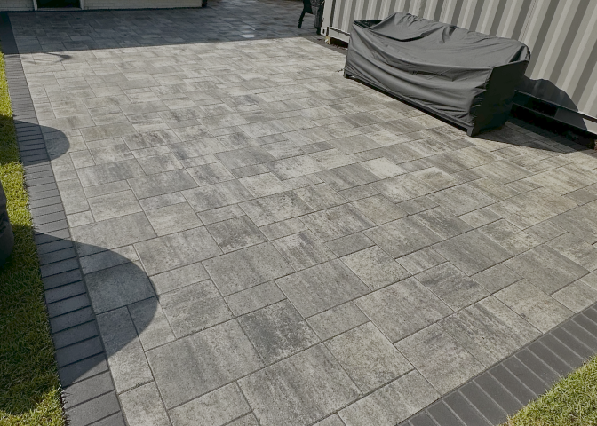 He selected Belgard® Dimensions™ 12 in Magnolia for the central patio inlay, a contemporary yet warm tone. He accented it with a 6×9 Midnight border, creating a sleek contrast that anchors the space.
