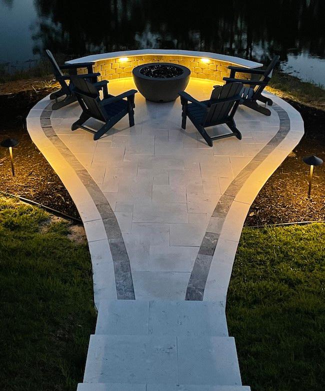 The wall system under the patio gives it a floating appearance. Low voltage lighting was added on both the upper and lower patios.