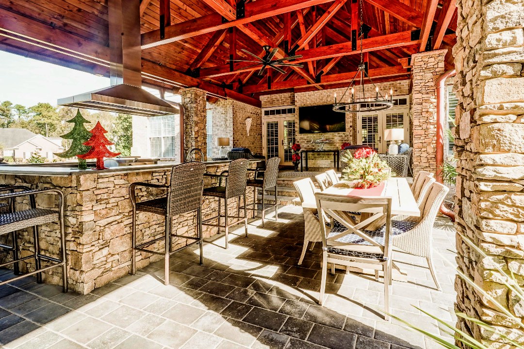 Monty and Joani Newsome had long dreamed of the perfect outdoor space for entertaining that would feel cozy yet open. After surfing the internet for inspiration, they decided a pavilion would be ideal. They worked with contractor Pete Wigand of Blue Chip Building, to make it a reality. Pete partnered with Atlantic Barn and Timber to create the 800-square-foot structure.