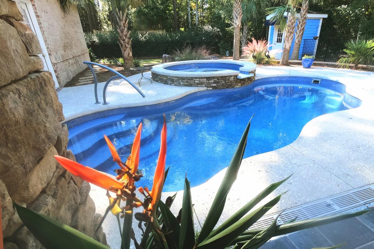 Prestige Pools installed an easy maintenance pool and spa in 2019 with a Tabby pool deck and hot tub coping.