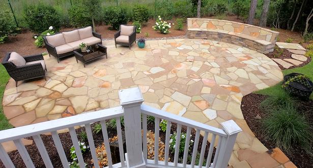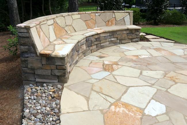 The homeowners chose TN Crab Orchard flagstone for the patio and bench to complement the stone veneer used on their house. Chardonnay Country Ledgestone, a cultured stone, was applied to cover the base of this custom-made, 15-foot long seating wall.