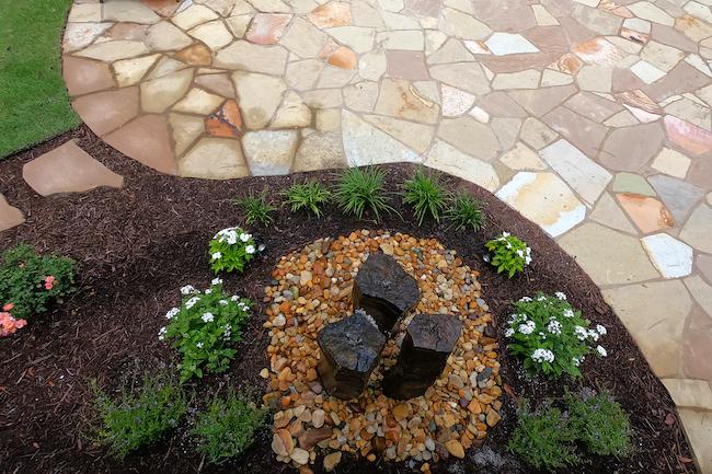 Double-shredded hardwood mulch was used effectively throughout the project to paint an ideal backdrop for the stone and greenery and can be refreshed to enhance the yard year after year.