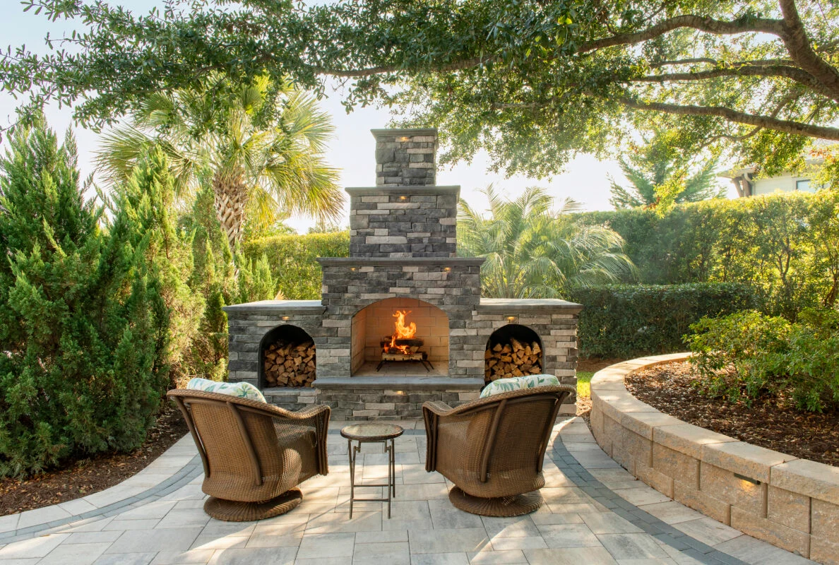 Tucked beneath the canopy of a majestic 30-foot Live Oak, Dan and Robin’s backyard fireplace feels like a secret winter hideaway. This three-tiered wood-burning fireplace was built from Kingsford Ledgestone by Stonecraft, set against Belgard Hatteras Dimensions pavers accented with a Holland Stone Slate border. The design blends seamlessly with the adjacent pool area and was completed after three weeks of dedicated craftsmanship by Juan Santiago and his crew at JC’s Hardscape & Landscaping.