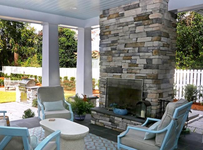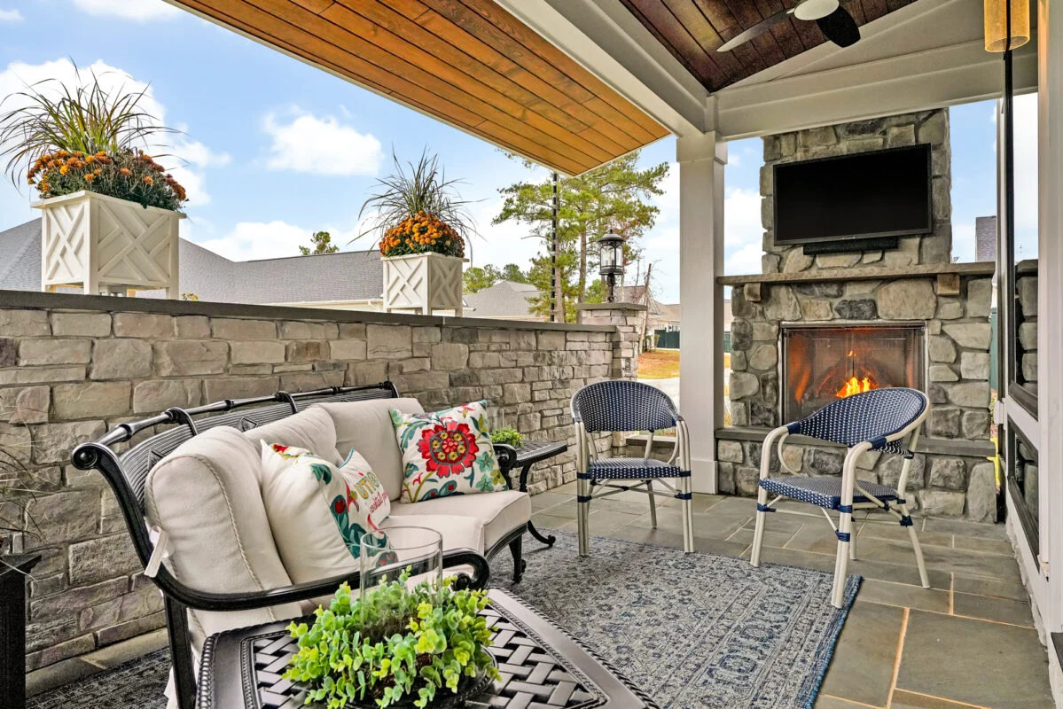 On Rick and Bernadette’s back porch, a stacked stone fireplace with a chiseled hearth and mantel sets the tone for cozy coastal evenings. The covered porch ceiling, finished in a natural stain, adds a subtle nautical touch. This inviting space was installed by Mack Braxton and his team at RMB Building and Design, making it ideal for winter grilling and holiday entertaining alike.