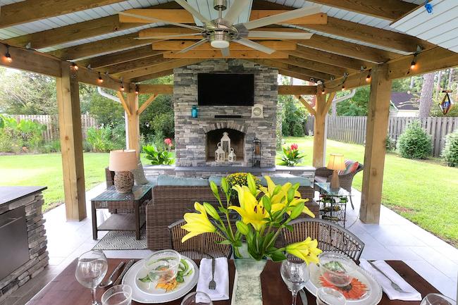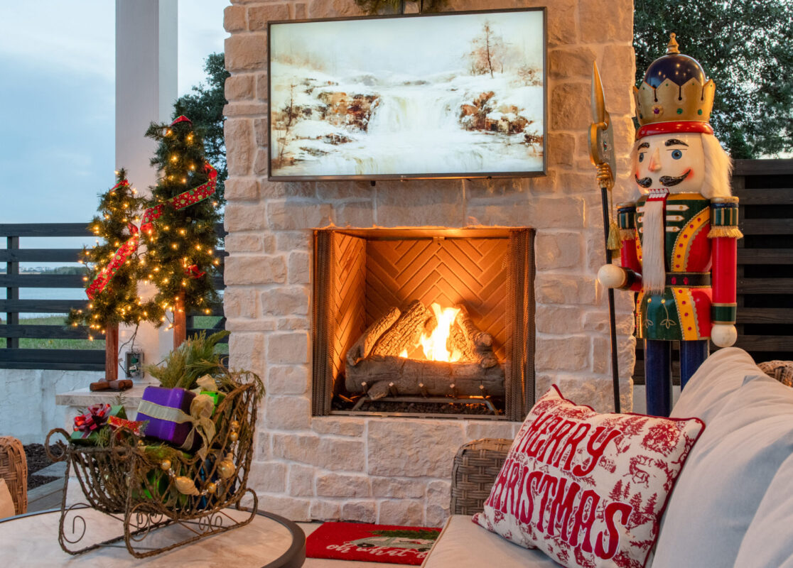 The pavilion, lovingly named ‘The Sanctuary’ by Monty and Joani Newsome, is anchored by an impressive fireplace built by Pietrucci Masonry. The couple selected Shawnee Ledgestone paired with Rainbow Sandstone for the mantel and hearth. It’s an elegant combination that balances warmth and sophistication. Pete Wigand of Blue Chip Building, partnered with Atlantic Barn and Timber, brought their vision to life in this 800-square-foot retreat that feels especially magical during the holidays.